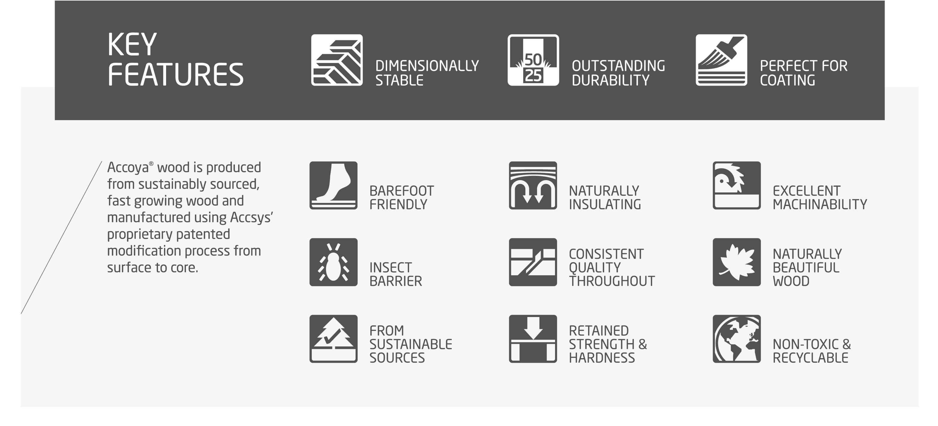 Accoya® wood is the result of decades of research and development that has brought together a long-established, extensively proven wood modification technique and leading-edge patented technology – acetylation to create a high performance wood, ideal for outdoor use and challenging applications.